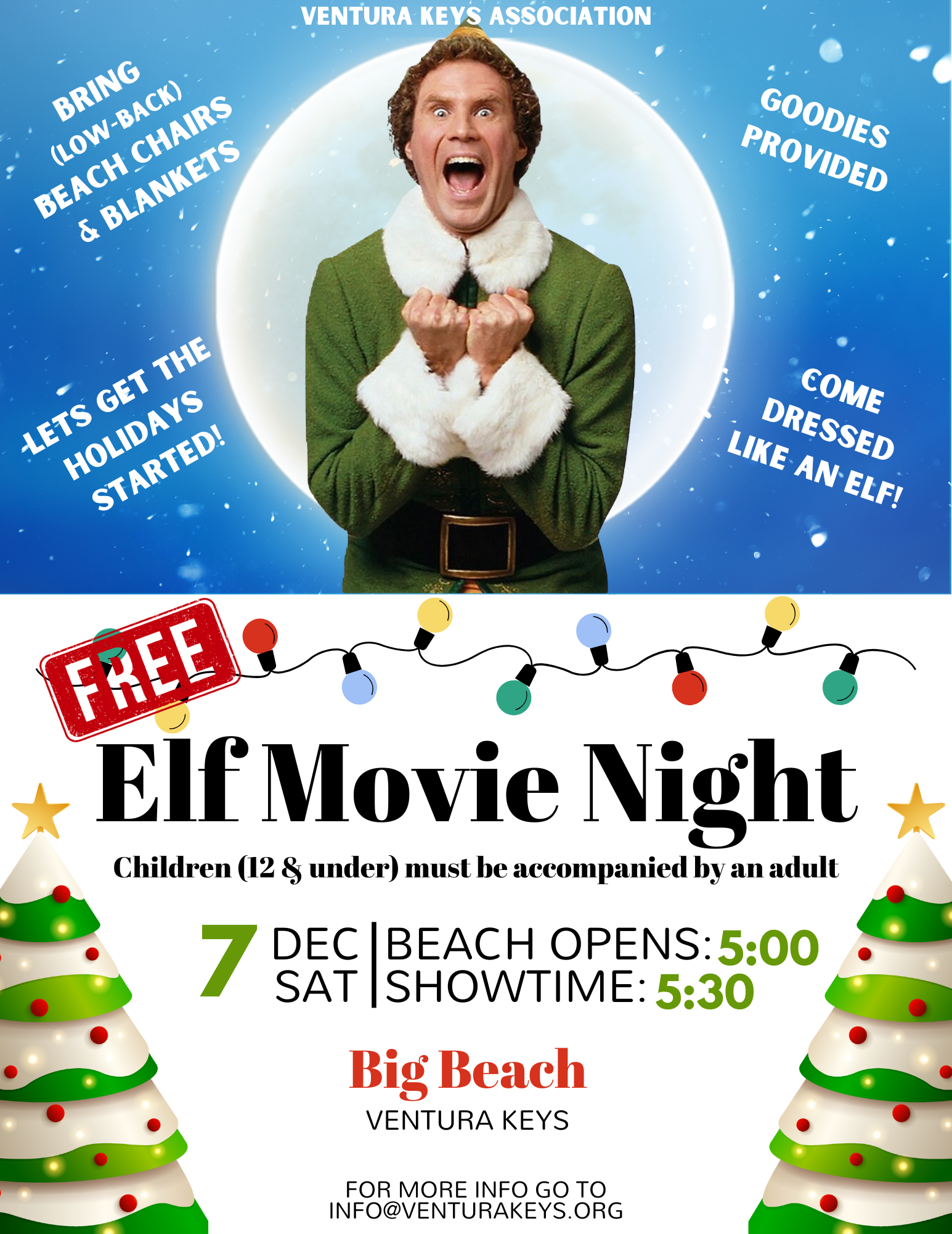 Ventura Keys 1st Ever Movie Night Let's get the holidays started! Date: Saturday, December 7th Showing: Elf Showtime: 5:30pm Place: Big Beach Cost: Free! Make sure you come dressed like an Elf. Goodies will be provided. 12 & Under Children Must be Accompanied by an Adult